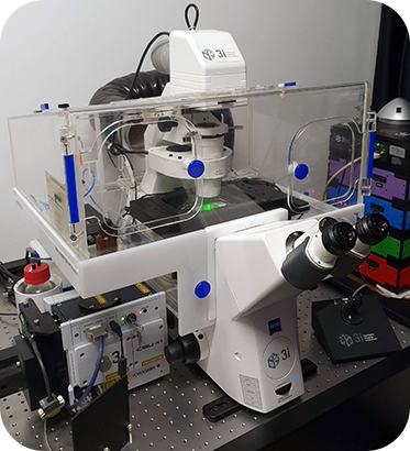 The 3i Marianas SDC spinning disk confocal microscope is a fast imaging system which provides a trade-off between confocality, resolution and speed. It is an inverted microscope ideal for live cell applications which require fast acquisition speeds rather than high resolution images. The scanning unit achieves confocality by directing light through a spinning disk with many small pinholes. Images are then acquired with a sensitive EMCCD which allows for very small exposure times but is limited in resolution to 512×512 pixels. The stage is motorized and furthermore equipped with a piezo for Z displacement so fast 4D imaging is possible in multiple stage positions. The system is also equipped with a large size incubator for temperature control and a small stage incubator for CO2 supply. With this system you can perform optical sectioning of fluorescent samples which are too thick for a widefield system such as the Zeiss Cell Observer. Even though its resolution is not as high as a point-scanning confocal system such as the Zeiss LSM 710, it is much faster. You can also check the Zeiss Cell Observer SD if you need a spinning disk with a Definite Focus system for long time-lapse acquisitions. If your personal computer cannot handle all the data you collected, check out the Big Guy or Colossus.