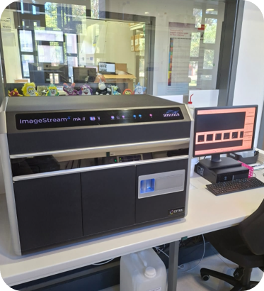 The Cytek Amnis ImageStreamX is a benchtop multispectral imaging flow cytometer equipped with two CCD cameras that can acquire up to 12 images simultaneously of each cell or object in brightfield, scatter and multiple fluorescent channels at rates up to 5000 objects/sec. It has five lasers - 375 nm, 488 nm, 561 nm, 642 nm and 785 nm (dedicated to side scatter). Cells in suspension are hydrodynamically focused in a flow cell, where they are illuminated by a brightfield light source and by lasers. High numerical aperture (NA) objective lenses collect fluorescence emission, as well as scattered and transmitted light from the cells which then intersect a spectral decomposition element that focus different spectral bands on different physical locations of two CCD cameras. By collecting large numbers of digital images per sample and providing numerical representation of image-based features, the ImageStreamX combines single cell standard microscopy information with the statistical significance of large sample sizes in standard flow cytometry. While you can use it to measure fluorescence intensity as in conventional flow cytometers, the best applications for the ImageStreamX take advantage of its imaging abilities to locate and quantify the distribution of signals within cells or even between cells in cell conjugates. The system also has a dedicated software application used for spectral compensation, image analysis and statistical analysis of acquired images (IDEAS) with predefined wizards for apoptosis, cell cycle, co-localization, internalization, shape change, spot counting and others.