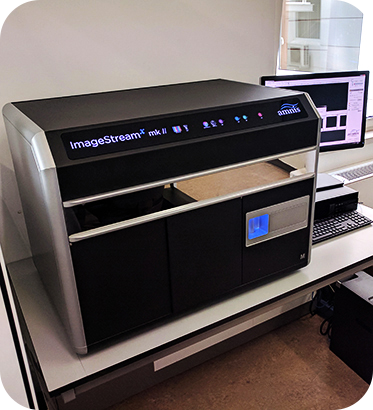 The Amnis ImageStreamX is a benchtop multispectral imaging flow cytometer equipped with two CCD cameras that can acquire up to 12 images simultaneously of each cell or object in brightfield, scatter and multiple fluorescent channels at rates up to 5000 objects/sec. It has five lasers - 375 nm, 488 nm, 561 nm, 642 nm and 785 nm (dedicated to side scatter). Cells in suspension are hydrodynamically focused in a flow cell, where they are illuminated by a brightfield light source and by lasers. High numerical aperture (NA) objective lenses collect fluorescence emission, as well as scattered and transmitted light from the cells which then intersect a spectral decomposition element that focus different spectral bands on different physical locations of two CCD cameras. By collecting large numbers of digital images per sample and providing numerical representation of image-based features, the ImageStreamX combines single cell standard microscopy information with the statistical significance of large sample sizes in standard flow cytometry. While you can use it to measure fluorescence intensity as in conventional flow cytometers, the best applications for the ImageStreamX take advantage of its imaging abilities to locate and quantify the distribution of signals within cells or even between cells in cell conjugates. The system also has a dedicated software application used for spectral compensation, image analysis and statistical analysis of acquired images (IDEAS) with predefined wizards for apoptosis, cell cycle, co-localization, internalization, shape change, spot counting and others.